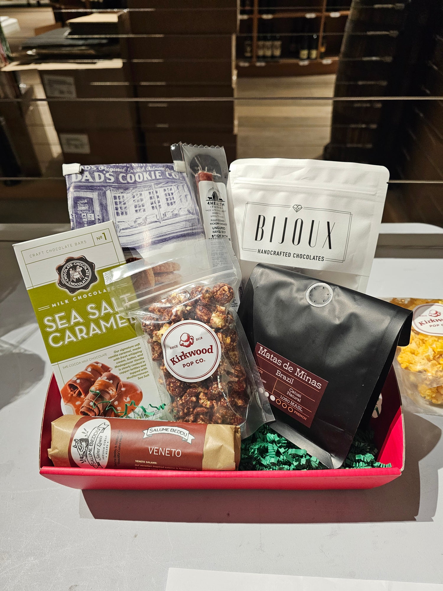 $100 Taste of STL Basket Includes: Bijoux Toffee & Truffles, Dad's Oatmeal Scotch Cookies & Shortbread Chocolate Chip Cookies, Kirkwood Caramel Popcorn, CCC Sea Salt Caramels & Peanut Butter Cups, Local Salami, Baetje Farms Cheese, LongStory Fresh Roasted Coffee, & Beautiful Gift Packaging.