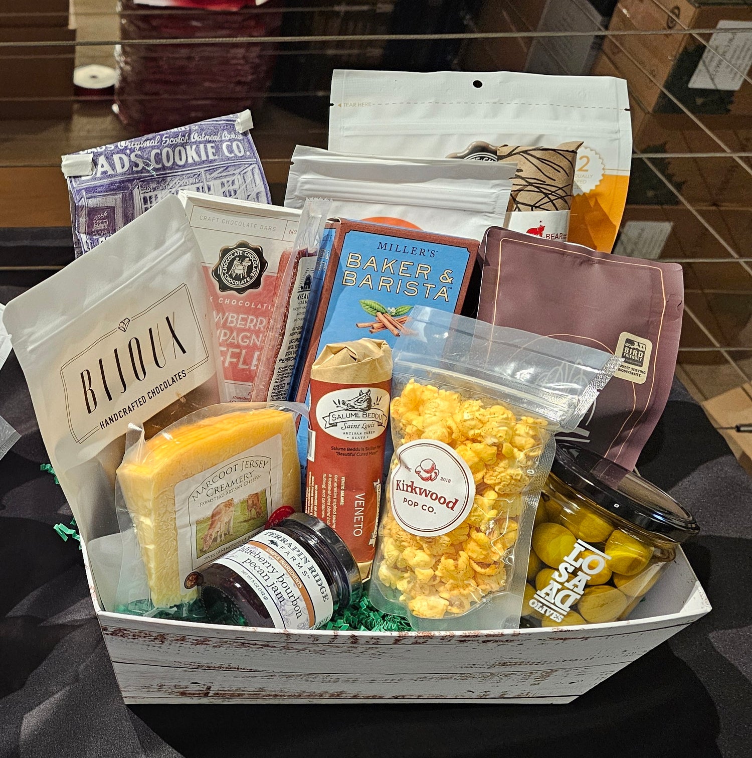 $65 Taste of STL Basket Includes: Bijoux Toffee, Dad's Oatmeal Scotch Cookies, Kirkwood Caramel Popcorn, CCC Sea Salt Caramels, Local Salami, Snack Sticks, Marcoot Cheese & Beautiful Gift Packaging.